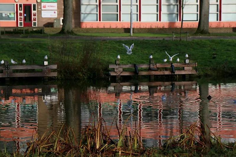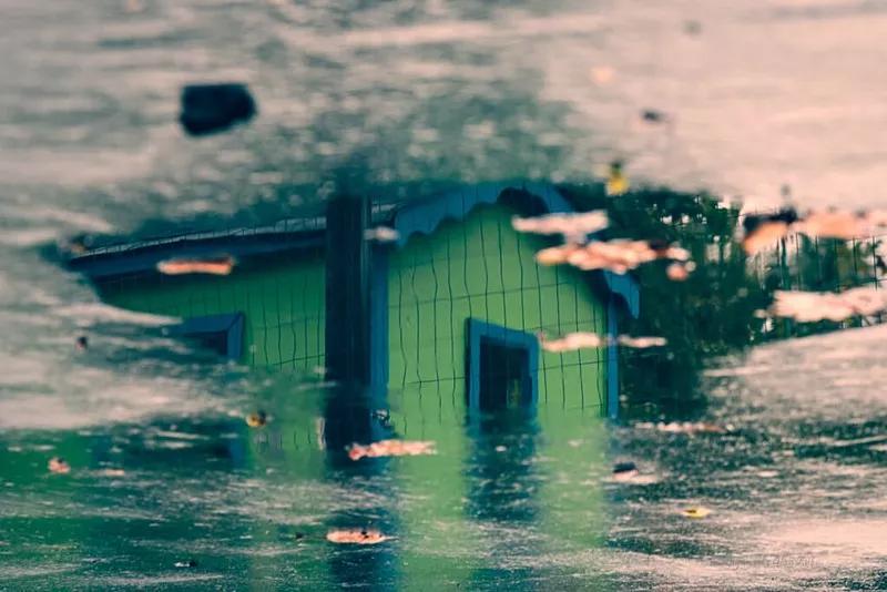 不平靜的水面會產(chǎn)生波紋,導致倒影的形狀發(fā)生變化。你可以利用這些產(chǎn)生變形的景物和實體進行對比,比如說,水中扭曲的建筑物倒影: