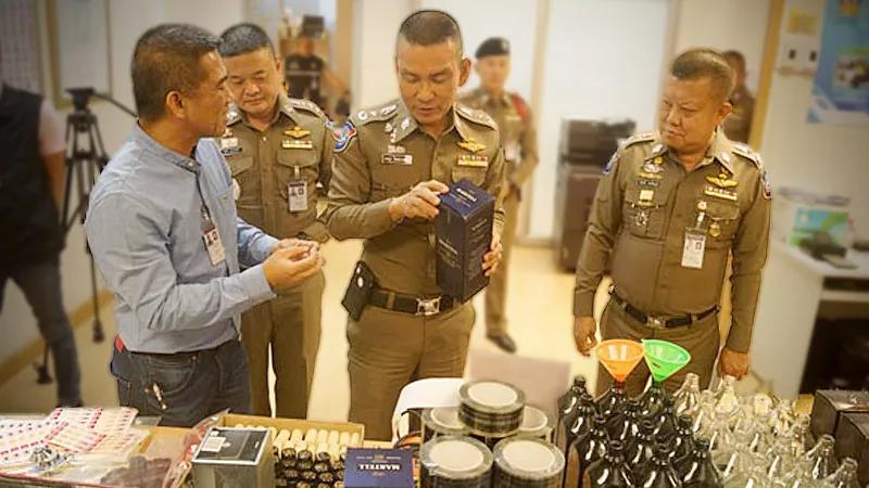 今年11月,有“假酒之王”稱號(hào)的63歲馬來西亞男子Chan Fat Yat在曼谷一停車場(chǎng)與客戶交貨時(shí)被捕。警方在現(xiàn)場(chǎng)繳獲了大量假冒洋酒、制假工具以及包裝盒,其中包括26瓶假冒尊尼獲加威士忌、100個(gè)尊尼獲加威士忌空瓶、252個(gè)偽造海關(guān)印章、以及眾多品牌烈酒與葡萄酒(尊尼獲加、芝華士、奔富Bin 389等)的酒標(biāo)等。