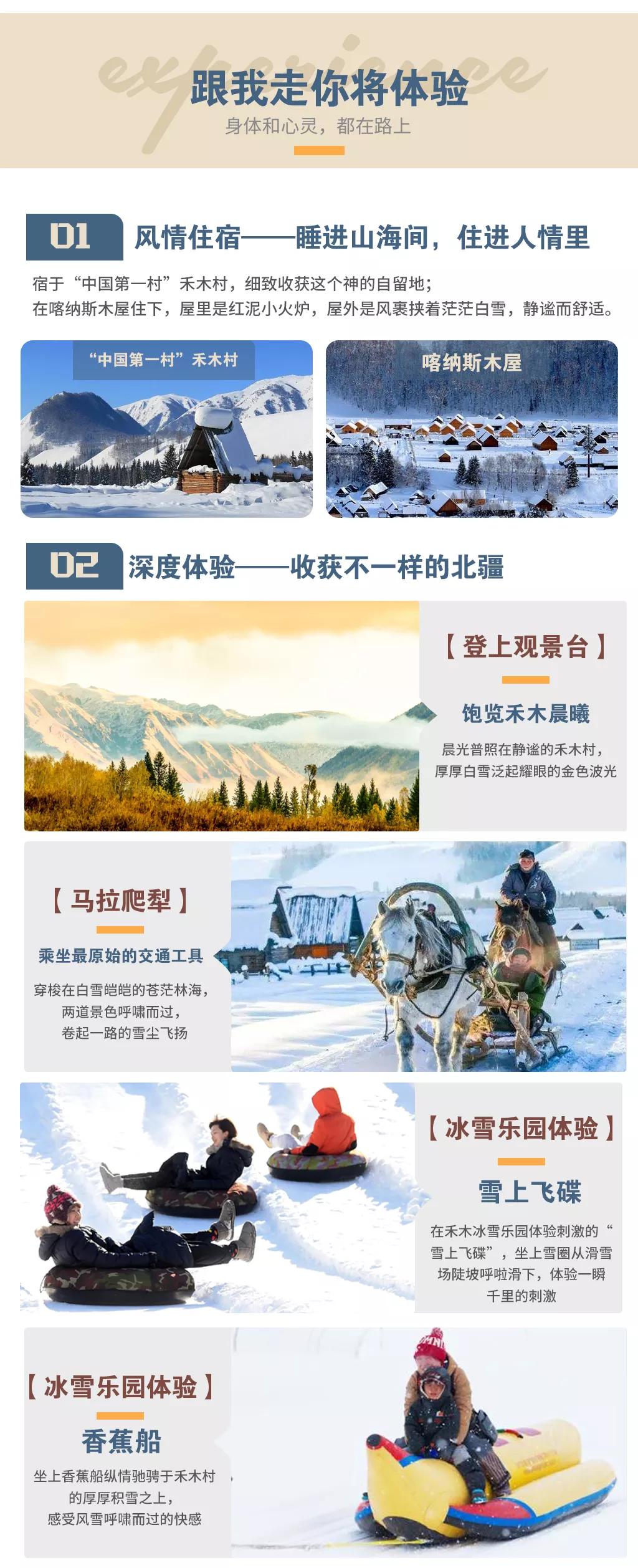 4、景區(qū)及小交通:費用包含門票以外的其它門票及小交通、娛樂項目需要游客自費,禾木冰雪樂園其它項目如單人雪地摩托、滑雪板、沖鋒舟、跳雪、雪地摩托車租憑等;