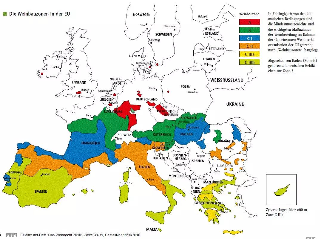 上眼看這張歐盟27國葡萄酒產(chǎn)區(qū)劃分圖(依據(jù)氣候)。