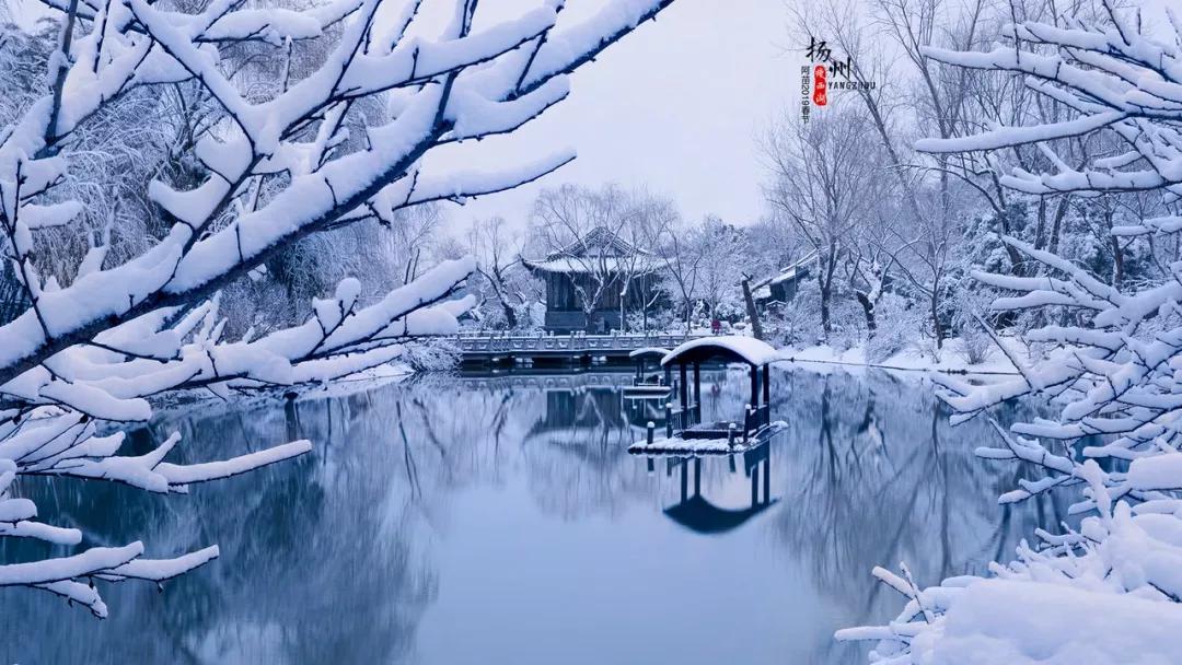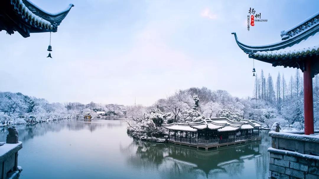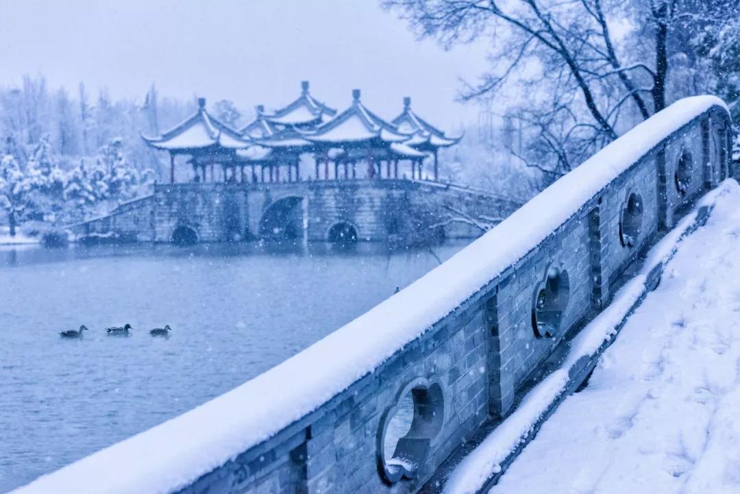 白雪灑滿十里揚(yáng)州路,燈光耀然醒目,映襯著如虹跨澗的紅橋勝似火。