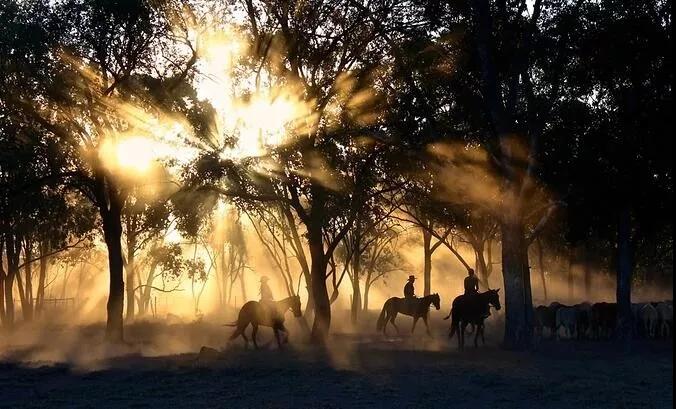 在逆光的樹(shù)林里面,牛,馬,羊,就是一個(gè)點(diǎn)