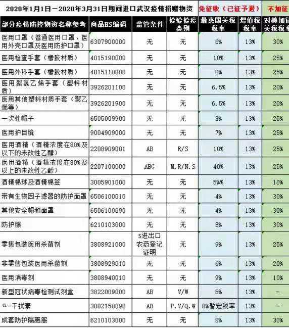 5、進(jìn)口且原產(chǎn)于美國(guó)的物資,不實(shí)施對(duì)美加征關(guān)稅措施,已加征稅款予以退還(2020.1.1-2020.3.31)。簡(jiǎn)而言之,就是海關(guān)不僅為疫情物資開(kāi)放綠色清關(guān)通道,還免所有進(jìn)口稅費(fèi)(企業(yè)自用或用于銷售的防護(hù)物資不適用“捐贈(zèng)物資”監(jiān)管方式,依然要繳納相關(guān)稅費(fèi))。