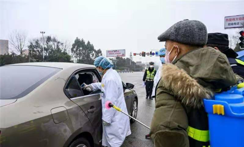 1月28日,四川省成都市龍泉驛區(qū),為了嚴(yán)防成都的過界入城車輛的疫情,龍泉驛區(qū)大面鎮(zhèn)醫(yī)院、錦江區(qū)醫(yī)院聯(lián)合公安、防疫、執(zhí)法等部門冒雨嚴(yán)防死守,檢查出入車輛及司乘人員,并對進城車輛消毒,對人員檢測登記體溫。