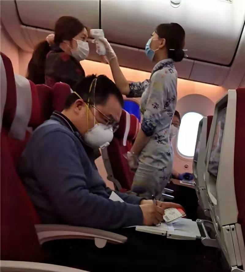 2月1日,在海南航空公司的國際航班上,機組人員向旅客發(fā)放健康申報表,并進行必要的健康檢測和消毒。中國民航嚴(yán)格有序的措施,確保國際間人員往來和目的地國家的健康安全。