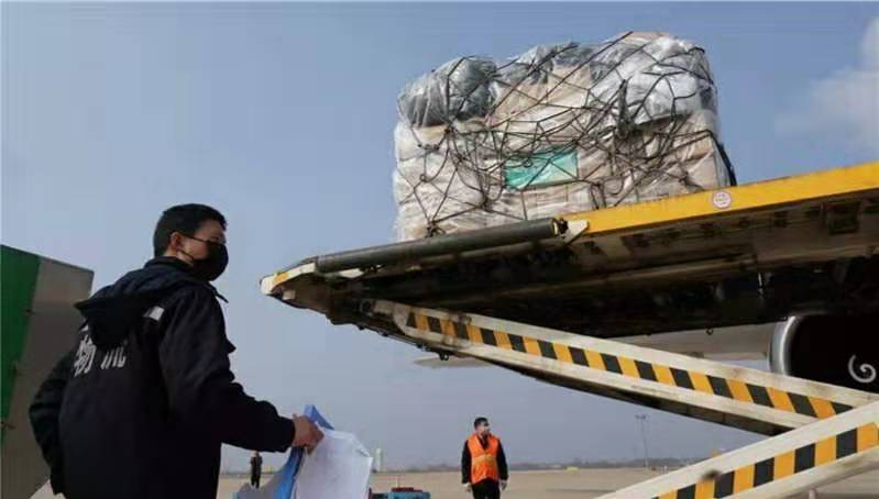 1月28日,工人在武漢天河國際機場卸貨。當(dāng)日,武漢天河國際機場共有3架全貨機滿載醫(yī)療防疫物資抵港,包含醫(yī)用口罩、醫(yī)用帽子、乳膠手套、防護服、消毒液等各類防護用品及醫(yī)療藥品,共計60余噸。