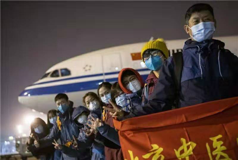 1月27日18時許,首都國際機場,北京市屬醫(yī)院援武漢醫(yī)療隊隊員合影。當(dāng)日,這支醫(yī)療隊乘坐國航包機奔赴武漢,隊員136人全部來自北京市各三甲醫(yī)院。隨同醫(yī)療團隊一起登機的,還有武漢急需的醫(yī)療用品。