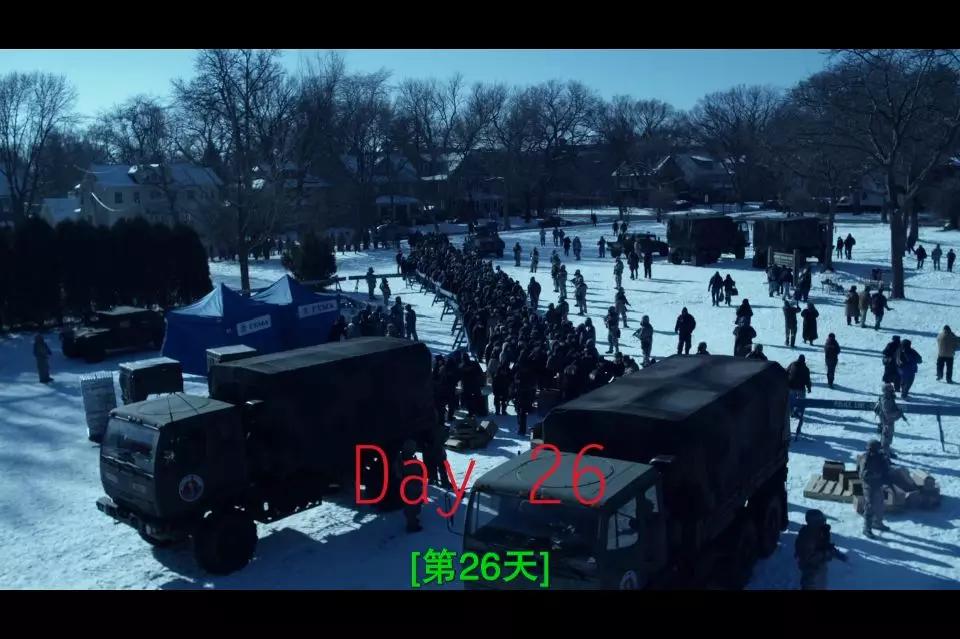影片中疫情持續(xù)下去的情況是:在26天里,經(jīng)濟回到配給制,人們?yōu)榱祟I(lǐng)政府配給的食物排起長長的隊伍。