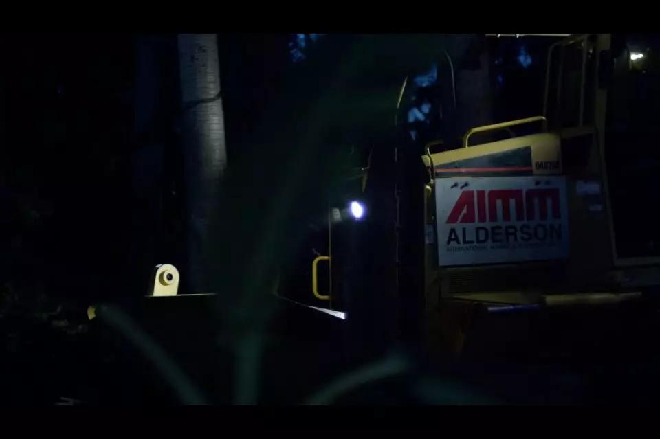 一輛重型推土機推倒了叢林里的樹木(注意LOGO,一號病人簽的文件,和空無一人的寫字樓里都出現(xiàn)了這個LOGO。暗示人類公司的開發(fā)活動對大自然的侵犯,最終導(dǎo)致了自身的災(zāi)難)