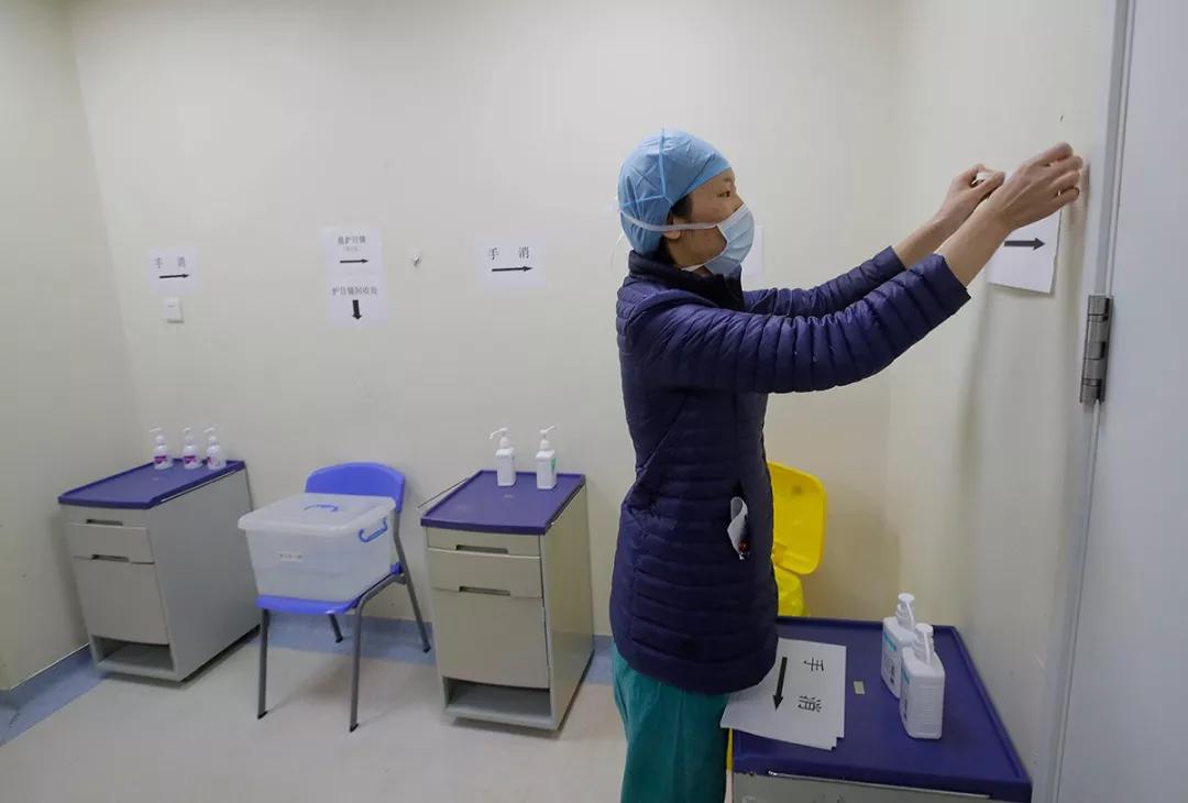 醫(yī)護(hù)人員在清潔區(qū)做進(jìn)入的最后準(zhǔn)備。