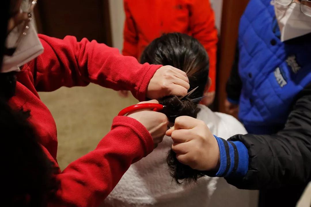 宣武醫(yī)院的護(hù)士在同事的幫助下剪掉了自己的長發(fā)。