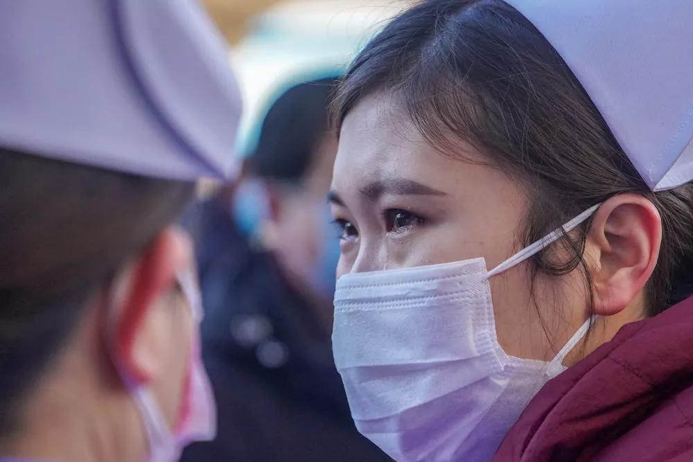 1月26日,在吉林省援助湖北省抗擊新型冠狀病毒感染肺炎醫(yī)療隊出征儀式現(xiàn)場,一名護士送別醫(yī)療隊同事時落淚。