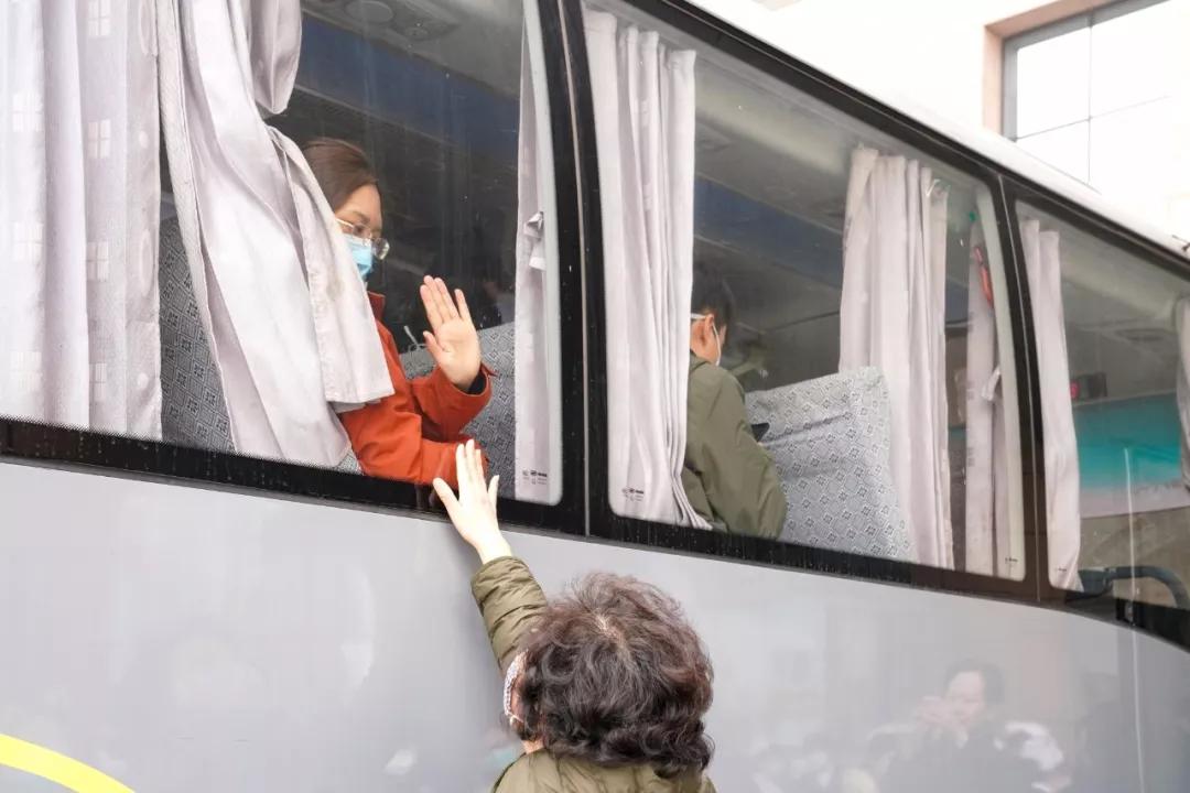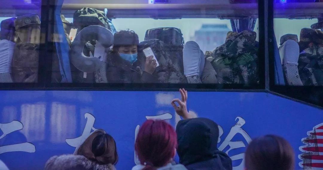 2020年1月27日下午3時許,在哈醫(yī)大二院,黑龍江省首批援助武漢醫(yī)療隊的成員們即將出發(fā)。車上的醫(yī)療隊員與家人依依惜別。