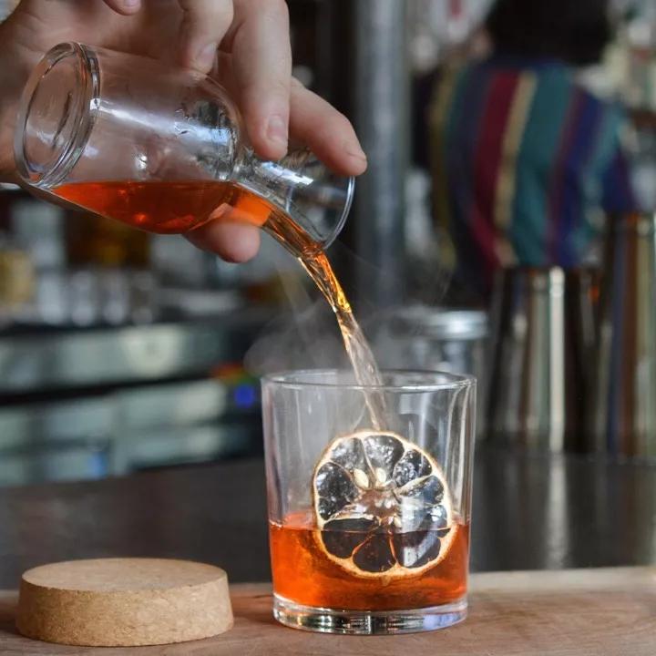 將點燃的百里香、迷迭香或薰衣草等草本植物,加入雞尾酒,不僅能增添風味,也是一種有趣的酒會互動方式?!白灾频哪瞎宵S油增加了波旁威士忌的深度和豐富性,同時還帶有一點秋天的香料,這種組合是完美的”,來自紐約Sen Sakana的飲品總監(jiān)Zachary Gross說。“把雞尾酒和百里香一起煙熏制作完成,帶來了秋天的味道。