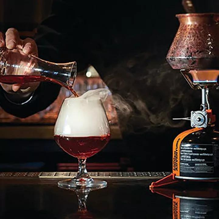 當它開始冒煙時,倒入冰過的杯中,立刻蓋上杯墊