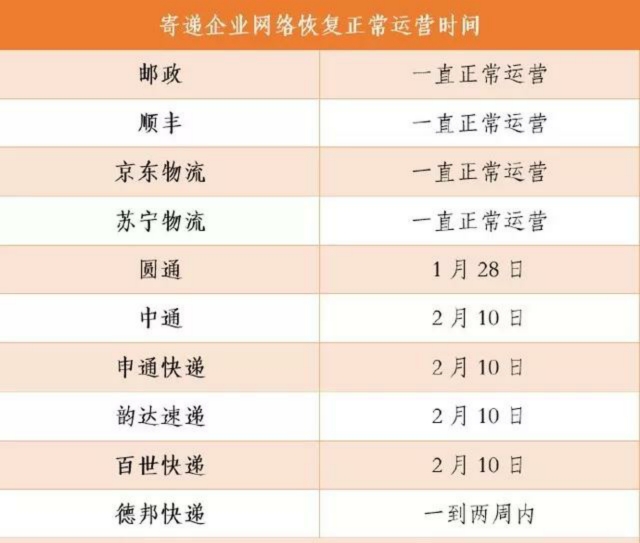 2020年2月10日消息,今日國(guó)家郵政局發(fā)布官方消息稱快遞公司全面復(fù)工,該公告公布了各大快遞物流公司復(fù)工時(shí)間表。