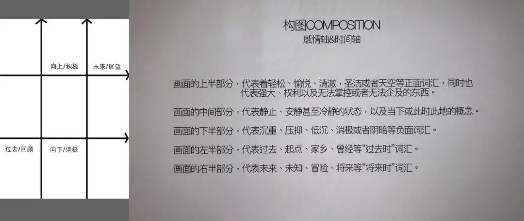 1.畫面中下-中-上/左-中-右的方向軸(以及由此構成的不同區(qū)域空間),既是視覺觀看(基本)的時間順序軸,也是視覺心理的情緒變化軸。