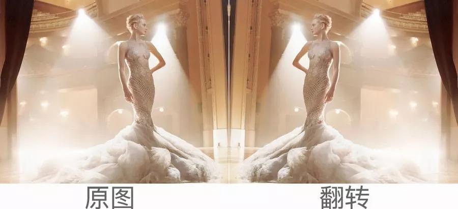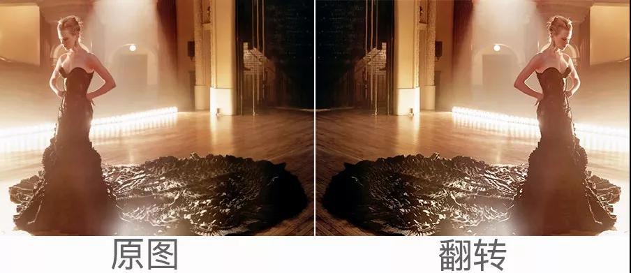 人物面部朝左,視覺情感傾向是憂郁內斂的,配合低頭的姿態(tài),仿佛有一種回顧往昔、自我勉勵、積蓄力量以面對未來挑戰(zhàn)的感受。無論是禮服的色彩還是遠景處的黑色部分都非常貼合這種情感聯想。反之,翻轉后則被削弱了。并且由于右邊空間的壓縮,使人物產生一種畏縮、抗拒未來的感覺。