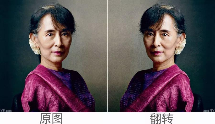 人物面部朝右,視覺情感傾向是積極昂揚的,與人物的整體姿態(tài)極為貼合。我們將其翻轉,會感覺到強烈的不和諧感。