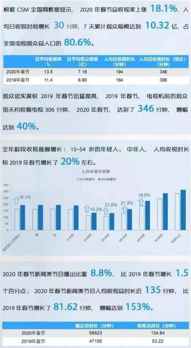 足不出戶、居家過年成為2020年全國人民的春節(jié)度假模式,電視再次彰顯出強者的力量。觀眾忠實度較2019年春節(jié)迅猛提高,2019年春節(jié),電視機前的觀眾每天約收看電視306分鐘,2020年春節(jié),達到了346分鐘,增幅達到40%。