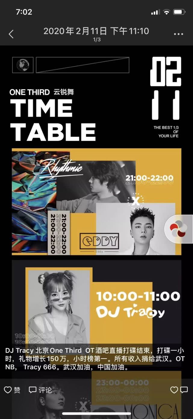 作為一家夜店的招牌之一,DJ們的日子也并不好過(guò)。2月11日,ONETHIRD在直播中邀請(qǐng)了嘉賓DJ Tracy。當(dāng)晚,Tracy創(chuàng)下了1小時(shí)收入150萬(wàn)音浪的成績(jī),價(jià)值約15萬(wàn)人民幣,一同歸入了ONETHIRD的公益通道。