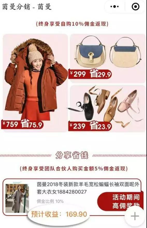 從淘寶電商起家的茵曼反應(yīng)更為迅速,疫情爆發(fā)后聯(lián)動(dòng)了600多家門店開展社群營(yíng)銷,利用小程序、朋友圈、微信群等方式,引導(dǎo)顧客消費(fèi)。此外,茵曼對(duì)外招募了1萬(wàn)名“茵曼推手”。只需在茵曼小程序掃碼下單滿100元,便可成為“茵曼推手”,有效期為180天,“推手”們可享受最高達(dá)實(shí)付金額20%的推廣傭金。