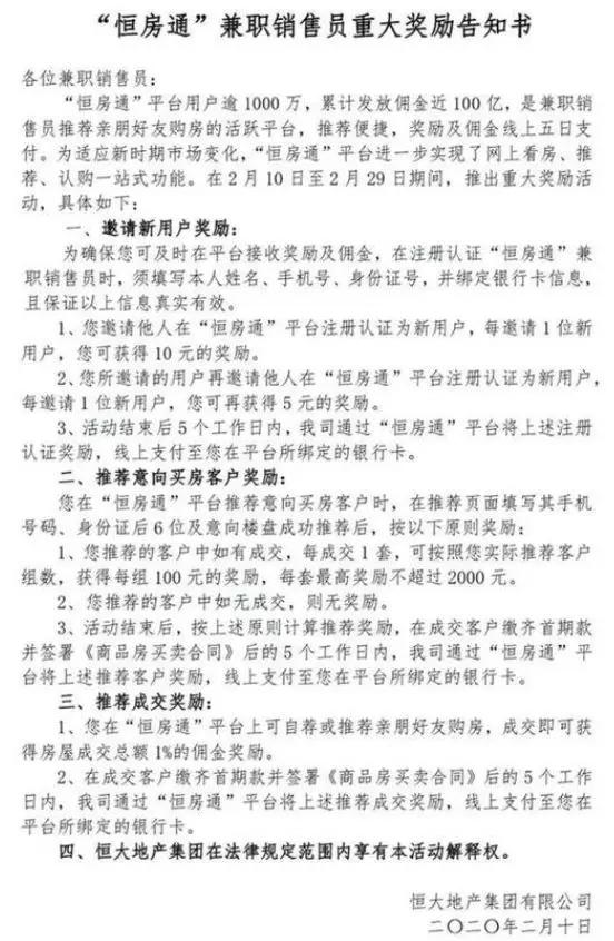 恒大“75折優(yōu)惠”線上營(yíng)銷,讓疫情之下房企的線上賣房模式受到關(guān)注。2月10日,恒房通上線分銷激勵(lì),針對(duì)自購(gòu)、推薦他人購(gòu)買、第三方購(gòu)買、推薦新客戶等不同情況,推出了不同傭金及獎(jiǎng)勵(lì),比如說(shuō)推薦別人購(gòu)買的,不僅定金全額返還,并可獲1%傭金及1萬(wàn)元獎(jiǎng)勵(lì)。