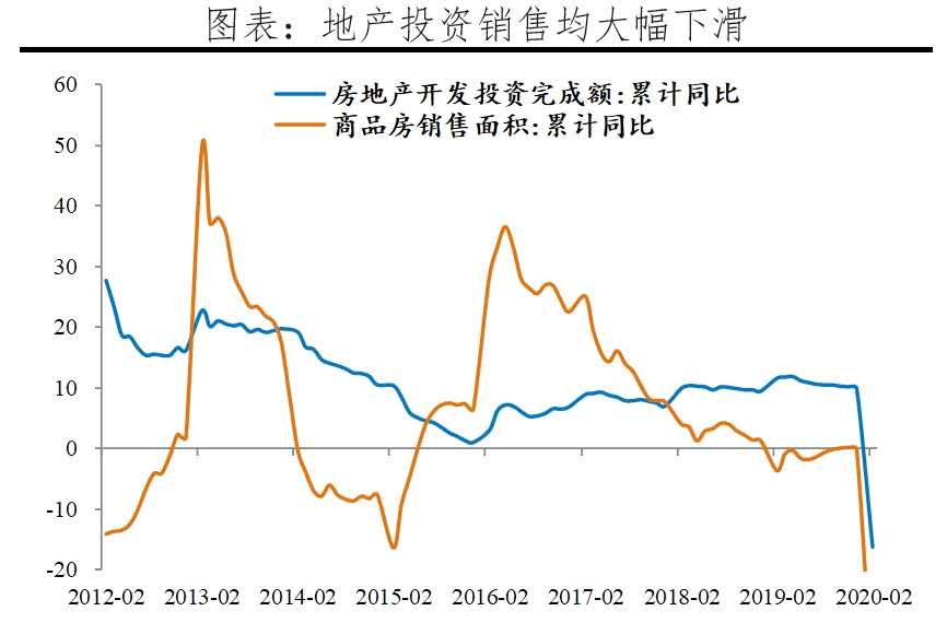 1-2月房地產(chǎn)投資累計(jì)同比-16.3%,較去年12月下滑23.7個(gè)百分點(diǎn),創(chuàng)歷史新低。1)土地購(gòu)置負(fù)增長(zhǎng),但土地溢價(jià)率較去年三四季度有所恢復(fù)。部分百?gòu)?qiáng)企業(yè)前兩月在土地市場(chǎng)零投資,1-2月土地購(gòu)置面積累計(jì)同比-29.3%,較去年12月下滑36.8個(gè)百分點(diǎn)。據(jù)中指院數(shù)據(jù),1-2月300城土地平均成交溢價(jià)率分別為11.6%和11.1%,而去年三四季度分別為10%和9%,300城住宅用地流拍面積減少37%。2)新開工、竣工增速均暴跌。1-2月新開工面積、施工面積、竣工面積累計(jì)同比分別為-44.9%、2.9%、-22.9%,分別較12月下滑52.3、6.2和43.1個(gè)百分點(diǎn)。3)庫(kù)存去化速度放緩,但仍處歷史低位。1-2月商品房待售面積累計(jì)同比為1.4%,較12月上升5.2個(gè)百分點(diǎn),但由于此前庫(kù)存去化充分,當(dāng)前商品房待售面積仍為近五年低位水平。未來復(fù)工推進(jìn)、地產(chǎn)銷售復(fù)蘇、加快期房竣工和舊改等,將托底房地產(chǎn)投資。