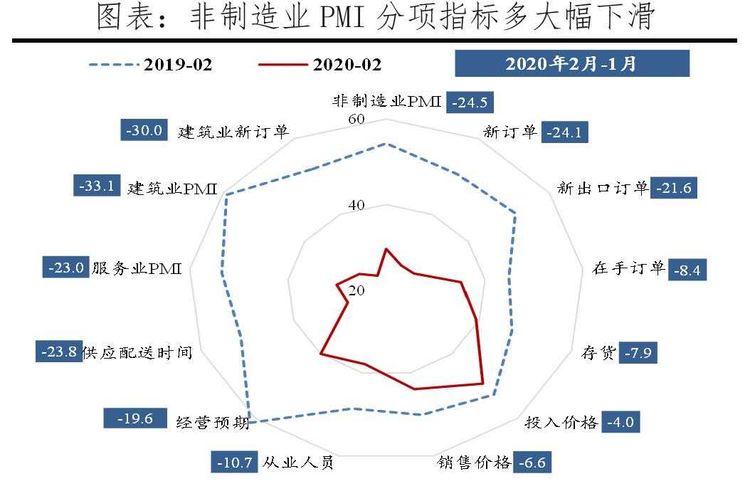 2月制造業(yè)PMI指數(shù)為35.7%,較上月大幅下滑14.3個(gè)百分點(diǎn),低于2008年11月全球金融危機(jī)時(shí)的38.8%。分項(xiàng)來看:1)生產(chǎn)放緩。2月PMI生產(chǎn)指數(shù)為27.8%,較上月大幅下滑23.5個(gè)百分點(diǎn),與疫情沖擊下企業(yè)延遲復(fù)工、生產(chǎn)停滯有關(guān)。2)內(nèi)外需求疲弱。2月新訂單和新出口訂單指數(shù)分別為29.3%和28.7%,分別較上月大幅下滑22.1和20.0個(gè)百分點(diǎn)。3)價(jià)格指數(shù)下滑,企業(yè)虧損和通縮風(fēng)險(xiǎn)加大。2月原材料和出廠價(jià)格指數(shù)分別為51.4%和44.3%,較上月分別下滑2.4和4.7個(gè)百分點(diǎn)。出廠價(jià)格和原材料價(jià)格指數(shù)差值擴(kuò)大,中下游企業(yè)盈利壓力加大。4)采購(gòu)量和經(jīng)營(yíng)預(yù)期指數(shù)大幅下滑,原材料庫(kù)存大降、產(chǎn)成品庫(kù)存積壓。2月原材料庫(kù)存指數(shù)較上月下滑13.2個(gè)百分點(diǎn),后期有較強(qiáng)補(bǔ)庫(kù)存需求;產(chǎn)成品庫(kù)存指數(shù)較上月上升0.1個(gè)百分點(diǎn),反映疫情期間物流堵塞、消費(fèi)放緩導(dǎo)致的庫(kù)存積壓。5)大中小型企業(yè)PMI均大幅下滑,中小企業(yè)受沖擊更大。2月大中小型企業(yè)PMI指數(shù)分別為36.3%、35.5%和34.1%,較上月分別下滑14.1、14.6和14.5個(gè)百分點(diǎn)。