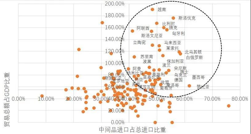 我們計(jì)算了世界各國(guó)中間品進(jìn)口額占總進(jìn)口額的比重、從中國(guó)進(jìn)口的中間品占其全部中間品進(jìn)口的比重以及各國(guó)貿(mào)易總額占GDP的比重。如果一國(guó)的前兩個(gè)指標(biāo)比較高,則說(shuō)明該國(guó)對(duì)中國(guó)的中間品進(jìn)口有較高的依賴度。在此基礎(chǔ)上,若該國(guó)同時(shí)擁有較高的對(duì)外貿(mào)易依存度,則說(shuō)明該國(guó)的整體經(jīng)濟(jì)對(duì)中國(guó)進(jìn)口的依賴程度更高,進(jìn)而表明該國(guó)在此次新冠疫情中會(huì)受到較大沖擊。