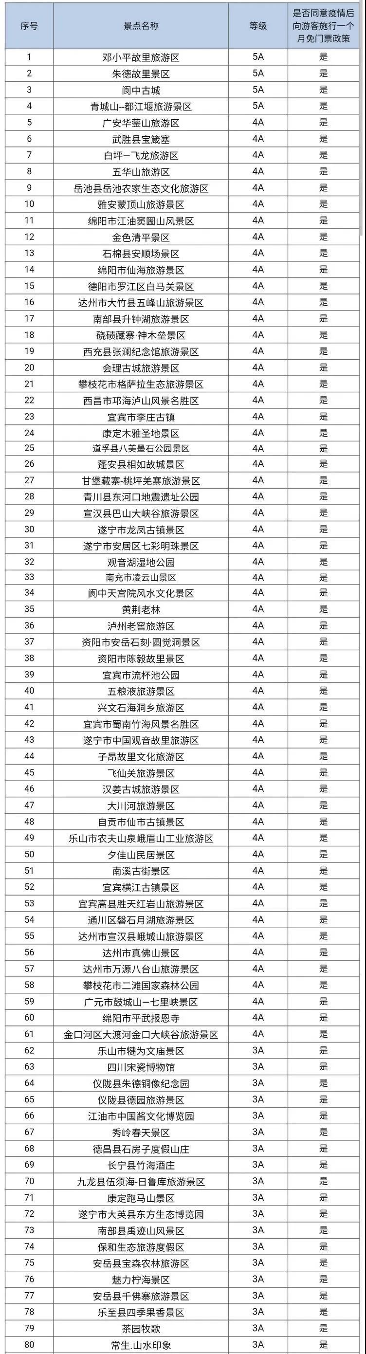 4月1日,四川省旅游景區(qū)協(xié)會(huì)公布,全省112個(gè)景區(qū)在4月對(duì)所有游客免門(mén)票!實(shí)行免費(fèi)景區(qū)名單如下: