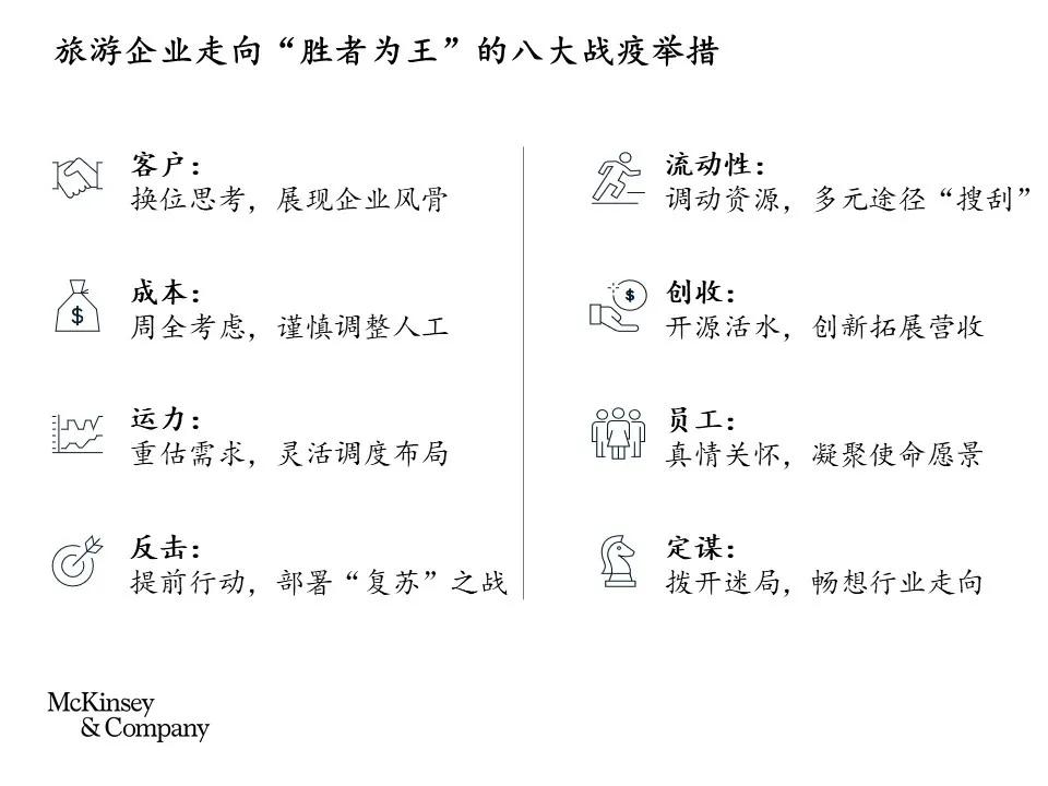 麥肯錫結合自身在旅游行業(yè)的豐富咨詢經(jīng)驗,以及過去幾周的重點調查研究,總結出針對旅游企業(yè)的八大戰(zhàn)“疫”舉措。這些舉措詳細闡明了克服短期現(xiàn)金流危機的方法,以及企業(yè)應在恢復期中如何謀篇布局,希望能為廣大旅游企業(yè)提供一些參考,并與全行業(yè)共勉。
