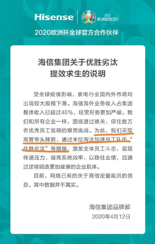 海信集團(tuán)和所有企業(yè)一樣,面臨渡過難關(guān)、保住數(shù)萬名優(yōu)秀員工飯碗的艱苦挑戰(zhàn)?!睘榇耍?strong>海信集團(tuán)采取高管帶頭降薪、通過末位淘汰加速員工隊伍“優(yōu)勝劣汰”等措施,激發(fā)全體員工斗志,層層傳遞壓力、提高系統(tǒng)效率,以穩(wěn)住業(yè)績,且通過逆境鍛造更加健康的企業(yè)肌體。”