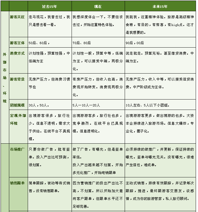 請(qǐng)看以下的分析,從外部環(huán)境,游客主體,產(chǎn)品趨勢(shì),等幾個(gè)方面,綜合對(duì)比過去十五年,現(xiàn)在,和未來十五年的一個(gè)變化和趨勢(shì)。