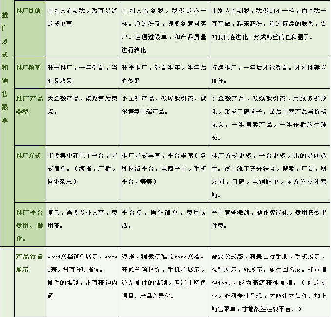 1、未來傳統(tǒng)旅行社的唯一營銷方向:粉絲經(jīng)濟(jì),口碑圈。全方位立體營銷,打造小而強(qiáng),充滿創(chuàng)造力和人情味的小公司。