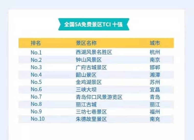 報告還顯示,頤和園、天壇公園、廣州長隆旅游度假區(qū)、黃鶴樓、秦始皇兵馬俑博物館、故宮博物院、蕪湖方特旅游度假區(qū)、瘦西湖、大唐芙蓉園、華山風景名勝區(qū)等亦位居全國5A收費景區(qū)TCI榜單的前列;西湖風景名勝區(qū)、中山陵景區(qū)、鐘山風景區(qū)、廣府古城景區(qū)、韶山景區(qū)等位居全國5A免費景區(qū)TCI的前列。