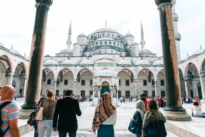 耗時七年建成的蘇丹艾哈邁德清真寺,又稱藍(lán)色清真寺,是伊斯坦布爾的地標(biāo)建筑。墻壁使用了土耳其瓷器名鎮(zhèn)燒制的藍(lán)彩釉貼瓷,以白色為底,刻有豐富的花紋圖案,使得整個清真寺內(nèi)都充滿了藍(lán)色。清真寺是伊斯坦布爾最大的圓頂建筑,四周建有六座宣禮塔,是全世界唯一擁有六座高塔的清真寺,世界十大奇景之一。