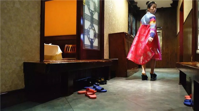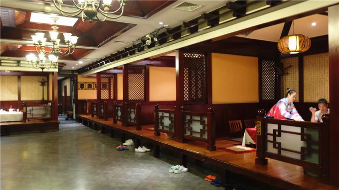 這個飯店里的陳設和布局,都是有著鮮明的朝鮮特色的,墻紙、掛飾、裝修調(diào)調(diào)暖色而濃重。