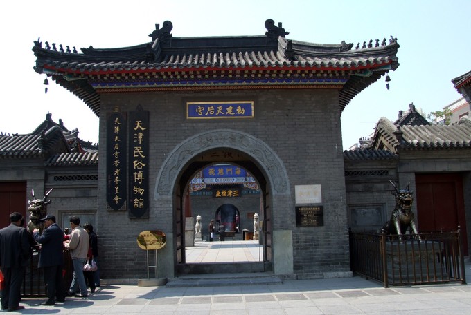 天后宮位于古文化街中心,也是古文化街古跡的核心,祭祀保佑出海遠(yuǎn)航平安的天后娘娘,已有600余年歷史。現(xiàn)在是天津民俗博物館的所在地,館內(nèi)介紹了天津城歷史、民俗,陳列著明代天津城磚、清代漕運(yùn)模型、清代水機(jī)等文物。