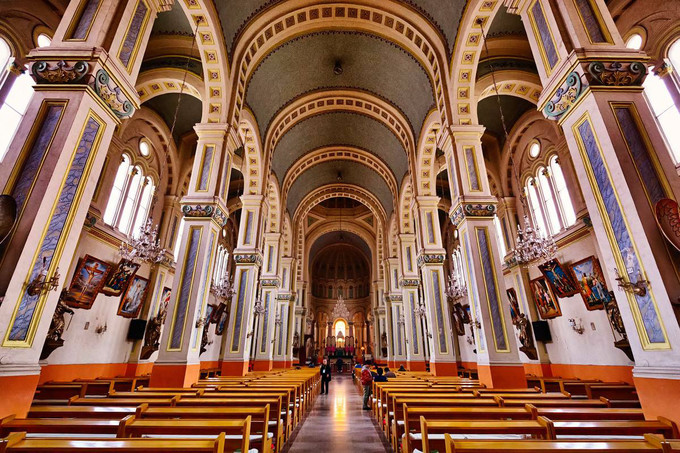 教堂外部用紅黃相間花磚砌成,三座呈品字形排列、高聳入云的塔樓上浮蓋著綠色銅片,塔樓頂上各有一個(gè)青銅十字架。走進(jìn)教堂,映入眼簾的首先是湖藍(lán)、白色、淡黃構(gòu)成的內(nèi)部主色調(diào),給人一種清新的感覺,14根立柱從門口排列到祭臺(tái)。教堂四周列著一座座精美的教徒銅像,墻壁上則掛著一幅幅記述耶穌受難故事的油畫,教堂內(nèi)還有圣母、耶穌、天使等的彩色塑像。