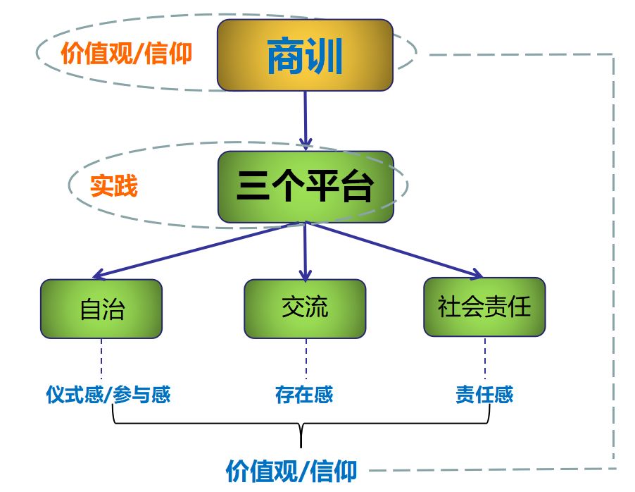 商訓(xùn)和商會“三個平臺”的關(guān)系,即價值觀和實踐層面是相互印證、相輔相成的關(guān)系。價值觀是靠“三個平臺”上的一系列工作為參與者帶來的儀式感、參與感、存在感、責(zé)任感等一系列“感覺”日積月累出來的,否則只能成為空洞的口號。
