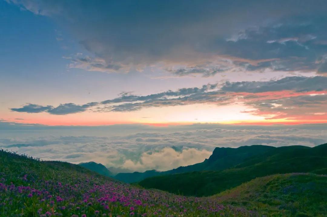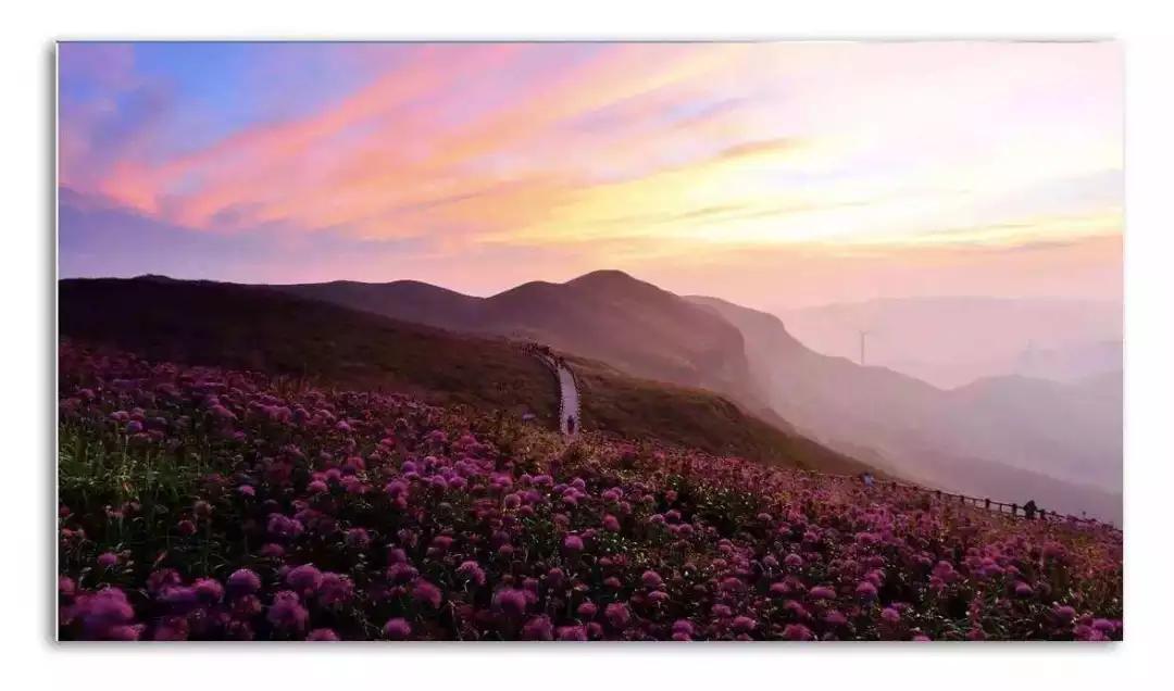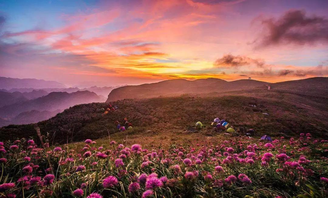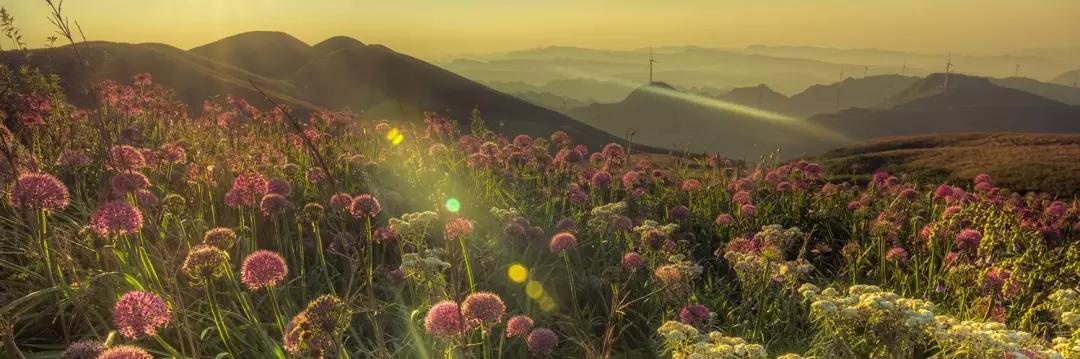 今天我們驅(qū)車來到云上花海的韭菜坪山腳下,為了能欣賞到韭菜坪最美的日出景象,我們把重頭戲放到了第二天一早,而今天大家在山下游玩拍照,這里盛開著一望無際紫色的馬鞭草 ,也可以上山去拍一個(gè)日落霞光哦。