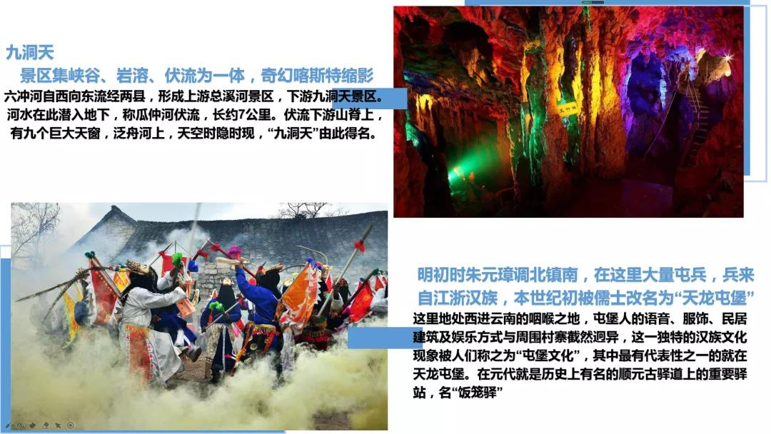 組成集伏流、峽谷、溶洞、天橋、天坑、石林、瀑布、冒泉及鐘乳石、卷曲石、生物化石等為一體的雄奇瑰麗的溶巖大觀。因其天窗洞口共有九個(gè),因此謂之"九洞天"。