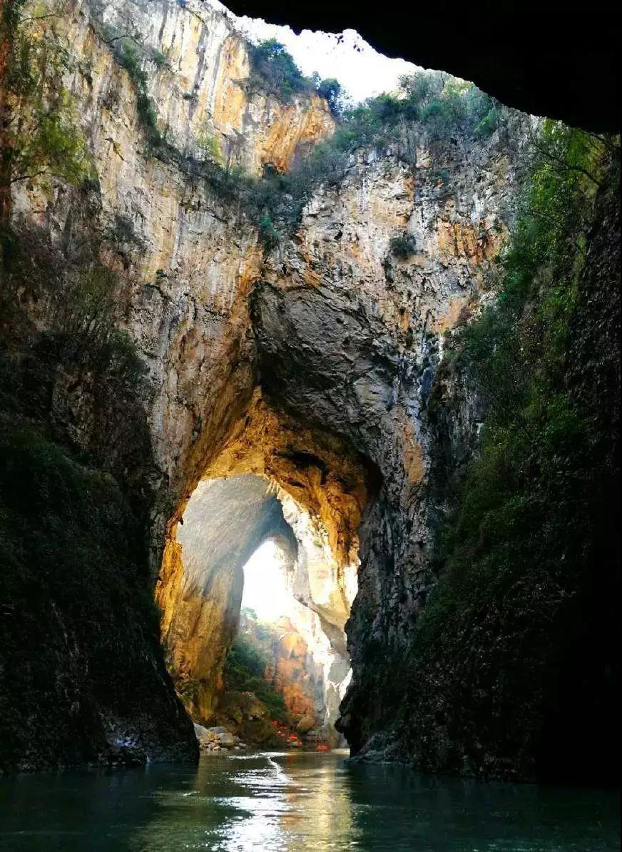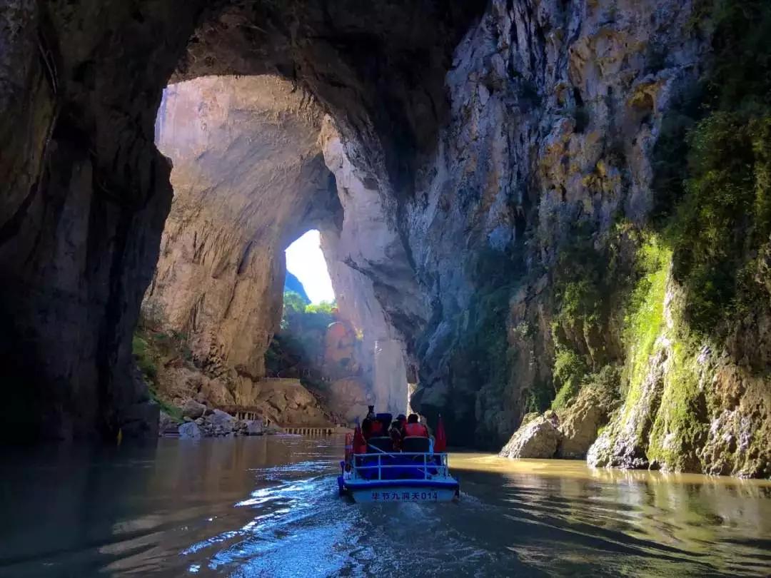早餐后前往1989年與黃果樹瀑布一道被評(píng)為貴州省十大風(fēng)景名勝區(qū)之一的九洞天。九洞天是國(guó)務(wù)院授予國(guó)家級(jí)重點(diǎn)風(fēng)景名勝區(qū)之一,是烏江干流六仲河上游流經(jīng)兩縣之間的一段以伏流(當(dāng)?shù)厝私嘘幒樱榇淼目λ固鼐C合地貌。該段伏流時(shí)隱時(shí)現(xiàn),神奇莫測(cè),形成地下河,當(dāng)?shù)厝朔Q瓜仲河,長(zhǎng)約7公里,在下游長(zhǎng)約6公里的河段上,箱形切割頂板多處塌陷,形成了大小不同,形狀各異的天窗洞口,使伏流明暗交替,洞洞相連,組合成集伏流、峽谷、洞穴、天橋、天坑、及生物化石為一體的雄奇瑰麗的巖溶大觀。