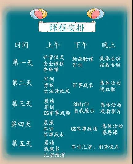 做一個(gè)屬于自己的臉譜·開(kāi)啟自己的競(jìng)賽模式體驗(yàn)非遺文化剪紙藝術(shù)·享造紙之樂(lè)·觀看愛(ài)國(guó)主義電影·3D打印屬于你的傳奇·徒步探索自然·誦讀經(jīng)典·才藝表演·紙·cs真人挑戰(zhàn)·軍事對(duì)抗賽·感恩課·國(guó)學(xué)文化線裝書(shū)·草坪運(yùn)動(dòng)會(huì)·茶話會(huì)·軍事匯演及文藝展示·結(jié)營(yíng)儀式·結(jié)業(yè)證書(shū)。