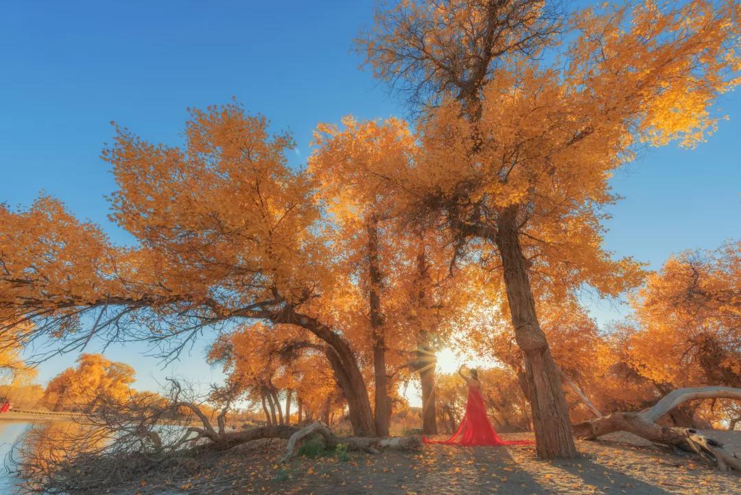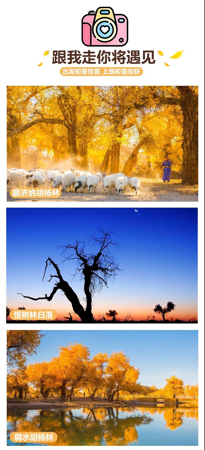 隨后我們在【額濟納胡楊林景區(qū)】中自行游玩攝影創(chuàng)作,胡楊有“生而一千年不死,死而一千年不倒,倒而一千年不朽”的說法,被世人稱為英雄樹。千姿百態(tài)的胡楊遍布在沙漠中,漫步輝煌的金秋胡楊林,用鏡頭記錄這中國最美的秋景;或者去找尋導游所說的一樹三葉的神奇景象——“幼樹葉如針似柳眉、壯齡樹葉酷似白樺、老年樹葉橢圓”,胡楊、藍天、來自大漠腹地的風聲襲來之時,胡楊林便泛起黃澄澄的層層漣漪,顯盡大西北秋冬那紅盛翠減的獨有風情。張藝謀的大片《英雄》中張曼玉與章子怡身著紅衣在這漫天的金色胡楊中打斗,踱步在胡楊林,熒屏內(nèi)的唯美畫面一一浮現(xiàn)。