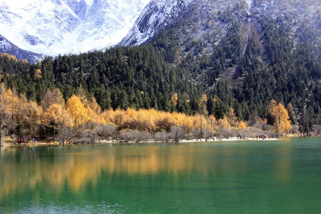 然后我們抵達(dá)被譽(yù)為“四季山水,山水世界”的旅游圣地——【畢棚溝】。秋天是畢棚溝景色最有層次的時(shí)候,遠(yuǎn)眺藍(lán)天山尖已戴白帽,山腰處卻還斑駁著枯黃與灰綠,濃綠的樹(shù)、深紅的葉、青青的湖、湛藍(lán)的天,此時(shí)的畢棚溝真正當(dāng)?shù)蒙弦粋€(gè)“五彩斑斕”。沿兩旁塞滿了楓樹(shù)、槭樹(shù)、鵝掌松、落葉松的小路踱步,遠(yuǎn)瞻奇特的萬(wàn)年冰川,看奔騰不息的瀑布懸飛而下。這是離成都最近的最美秋色,畢棚溝金秋的層林盡染會(huì)告訴你,這一切都值得。