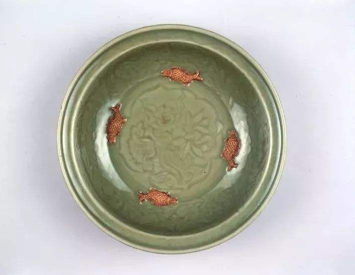 龍泉窯釉色蒼翠,北宋時多粉青色,南宋時呈蔥青色,沒有開片在器皿轉(zhuǎn)折處,往往露胎呈現(xiàn)胎色,瓷釉厚潤,裝飾上很少刻花、劃花,而流行用貼花、浮雕,例如在盤中常堆貼出雙魚圖案,在瓶身上貼出纏枝牡丹圖案。