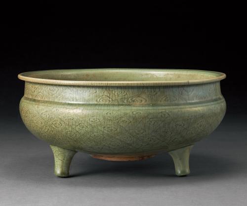 明代龍泉青瓷走向衰弱,器物胎體厚重,制作粗糙,胎色為灰黃,釉層厚,透明度高,釉表光澤強(qiáng),釉色有青灰、茶葉末、灰黃等幾種,裝飾以釉下刻花為主,亦有模印人物故事的裝飾方法。