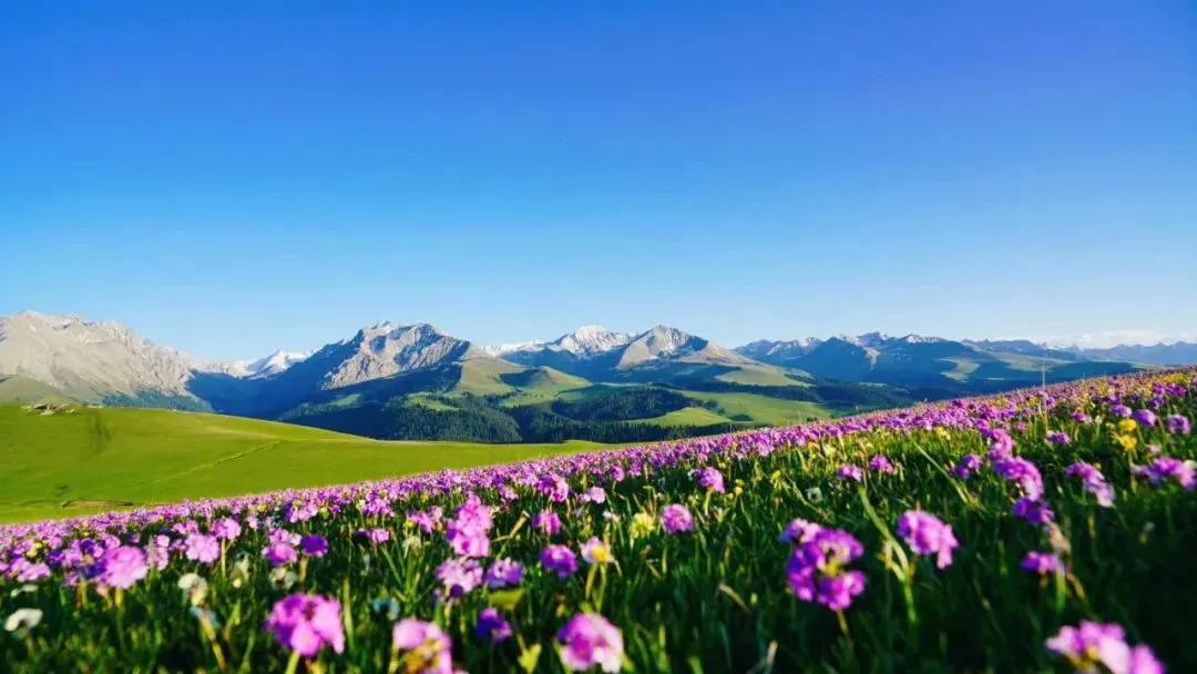 喀拉峻草原被稱為“五色花海”,6 月,草原上方的冰雪尚未融化,但茫茫草原早已生機(jī)盎然,白色、黃色等各色野花爭相齊放,而其中,最夢幻、最獨(dú)特的當(dāng)屬紫色報(bào)春花海。圓形的球狀花遍布草原,雪山下的紫色花海,大概是只有喀拉峻才擁有的奇景吧。
